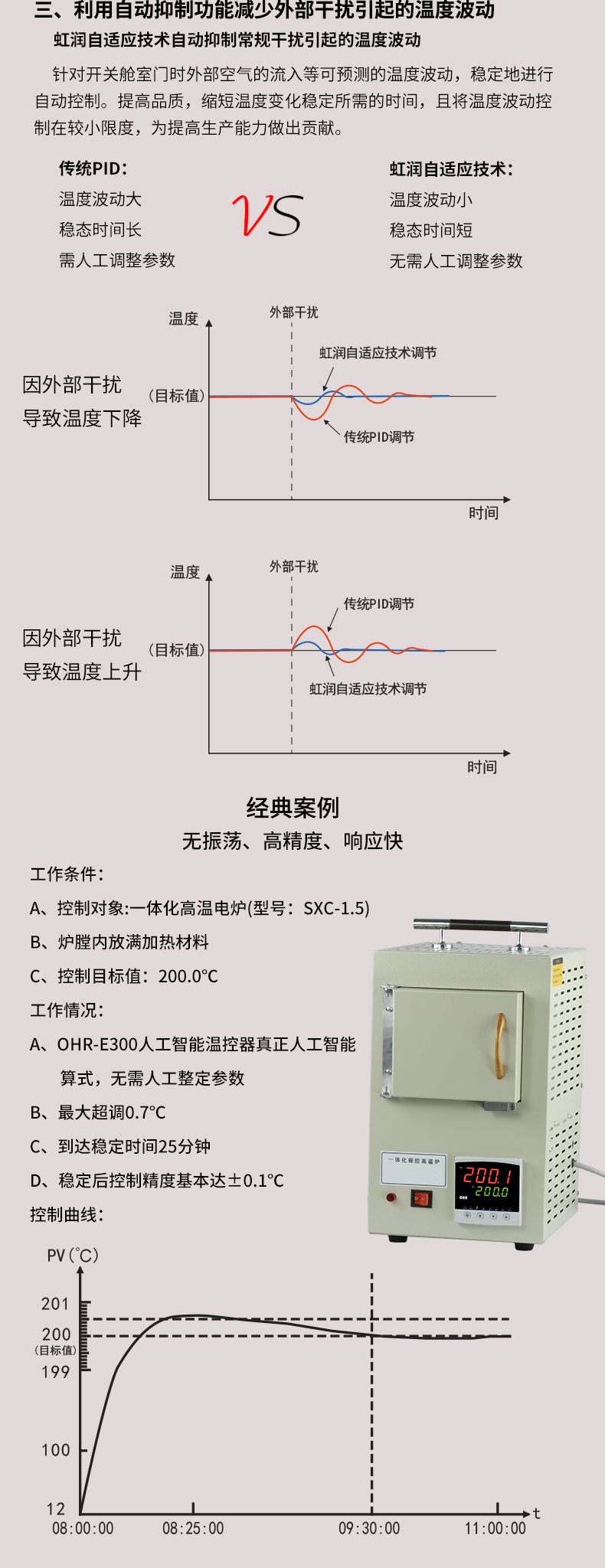 虹潤(rùn)公司是專(zhuān)業(yè)生產(chǎn)溫控器的國(guó)家專(zhuān)精特新“小巨人”企業(yè)。生產(chǎn)的人工智能溫控器,具有真正人工智能算式,無(wú)需人工整定參數(shù),控制精度可達(dá)±0.1°C,多種輸出類(lèi)型,高抗干擾等特點(diǎn)。產(chǎn)品獲得模糊PID控制儀及控制方法、人工智能調(diào)節(jié)器、智能化控制器、移相觸發(fā)控制器、閥門(mén)自動(dòng)手動(dòng)無(wú)擾動(dòng)操作控制方法及裝置等5項(xiàng)國(guó)家發(fā)明專(zhuān)利,主持起草工業(yè)過(guò)程控制系統(tǒng)用模擬輸入兩位或多位輸出儀表、物聯(lián)網(wǎng)智能溫度儀表通用技術(shù)條件、工業(yè)過(guò)程測(cè)量和控制系統(tǒng)用智能調(diào)節(jié)器等3項(xiàng)國(guó)家標(biāo)準(zhǔn),以及通信系統(tǒng)多通道數(shù)據(jù)采集控制終端規(guī)范軍用標(biāo)準(zhǔn),參與國(guó)際5G標(biāo)準(zhǔn)制定,取得模糊PID溫控儀等3項(xiàng)相關(guān)軟件著作權(quán)。產(chǎn)品廣泛應(yīng)用于電力、石化,冶金、制藥、食品等幾乎所有工業(yè)現(xiàn)場(chǎng),實(shí)現(xiàn)精準(zhǔn)控溫,保障生產(chǎn)安全與質(zhì)量。
