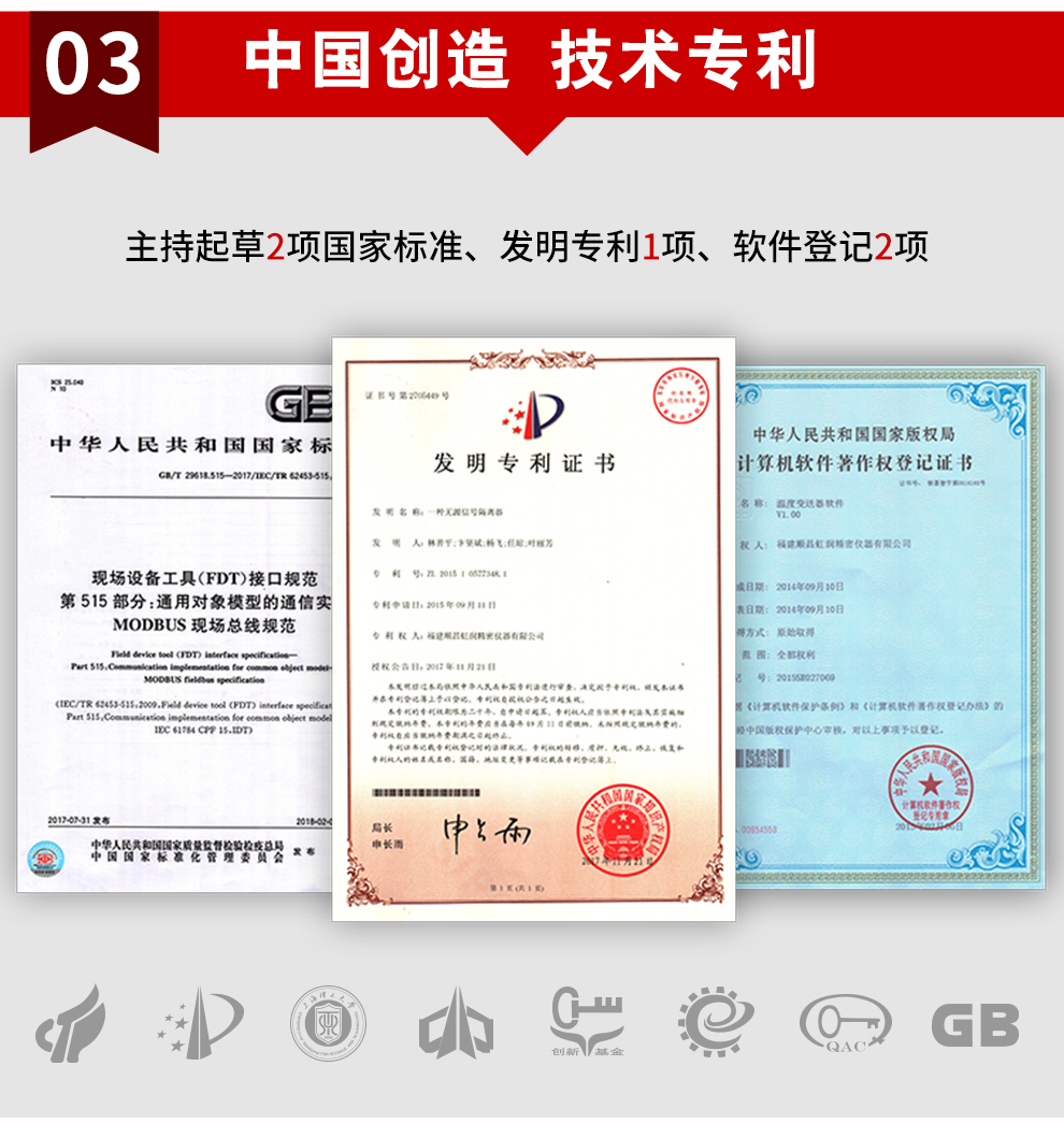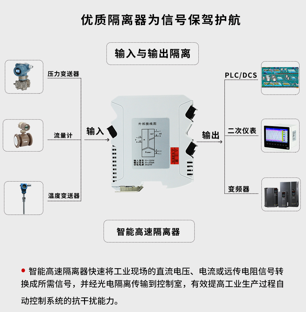 虹潤(rùn)公司是專業(yè)生產(chǎn)隔離器的國(guó)家專精特新“小巨人”企業(yè)。生產(chǎn)的智能高速隔離器 ,具有電壓電流遠(yuǎn)傳電阻輸入,10ms快速響應(yīng),輸入輸出電源三隔離,高抗干擾,低功耗發(fā)熱低等特點(diǎn)。產(chǎn)品獲得信號(hào)隔離器、一種二端子模塊、無(wú)源信號(hào)隔離器等3項(xiàng)國(guó)家發(fā)明專利,主持起草現(xiàn)場(chǎng)設(shè)備工具(FDT)接口規(guī)范、工業(yè)過程測(cè)量和控制系統(tǒng)用隔離式安全柵、工業(yè)過程測(cè)量和控制系統(tǒng)用配電器等3項(xiàng)國(guó)家標(biāo)準(zhǔn),以及通信系統(tǒng)多通道數(shù)據(jù)采集控制終端規(guī)范軍用標(biāo)準(zhǔn)。取得智能高速隔離器等3項(xiàng)相關(guān)軟件著作權(quán)。參與國(guó)際5G標(biāo)準(zhǔn)制定。產(chǎn)品廣泛應(yīng)用于電力、石化,冶金、制藥、水處理、機(jī)械配套等各種工業(yè)現(xiàn)場(chǎng)。