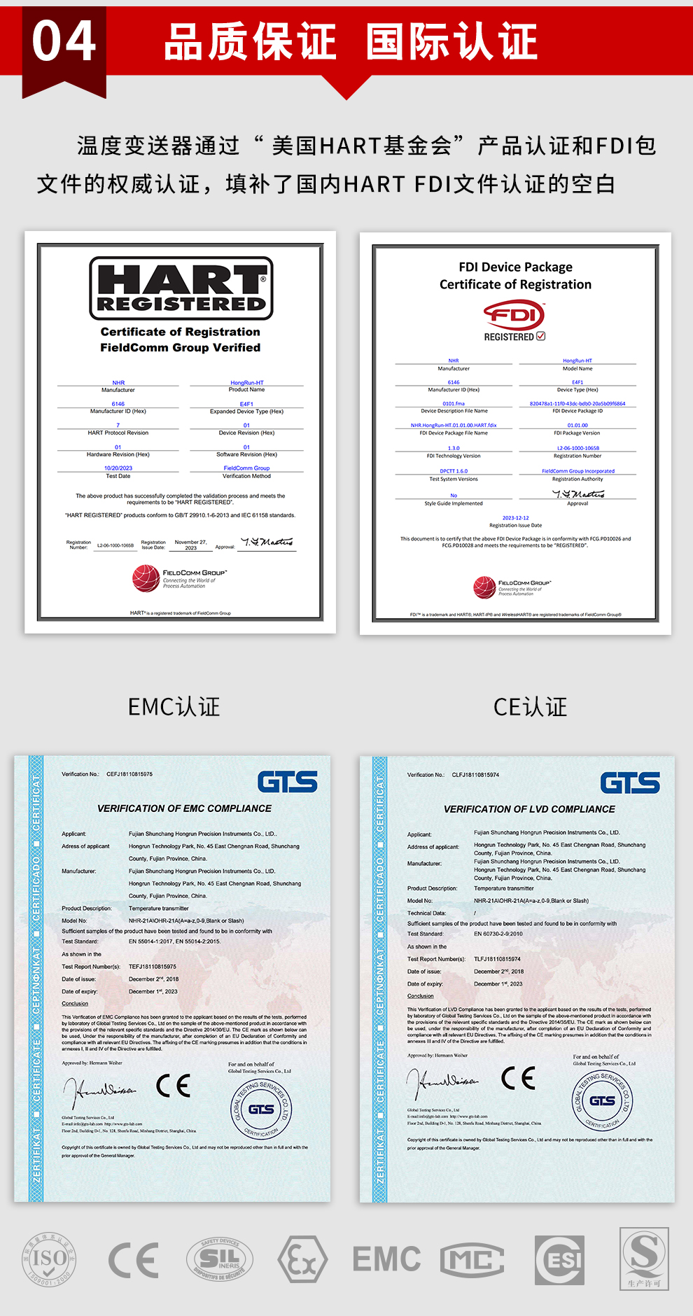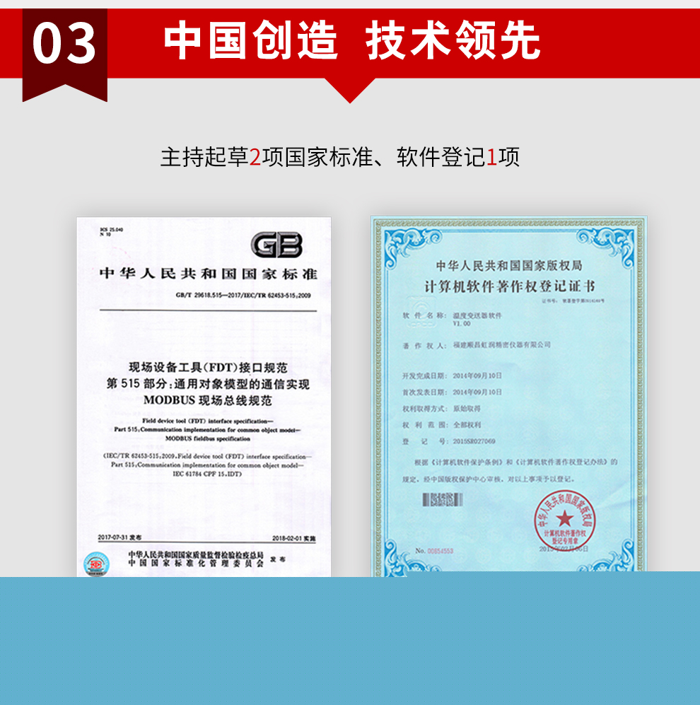 虹潤公司是專業(yè)生產(chǎn)溫度變送器的國家專精特新“小巨人”企業(yè)。生產(chǎn)的現(xiàn)場顯示隔離溫度變送器,具有可修改輸入信號類型,測量精度高,穩(wěn)定性好,帶HART或RS485通訊計等特點。該產(chǎn)品不僅通過德國萊茵 CE 認證與 SIL 功能安全認證,還獲得具備減震抗干擾能力的溫度變送器、信號隔離器、一種二端子模塊、無源信號隔離器等3項國家發(fā)明專利。主持起草物聯(lián)網(wǎng)智能溫度儀表、現(xiàn)場設(shè)備工具(FDT)接口規(guī)范、工業(yè)過程測量和控制系統(tǒng)用溫度變送器等3項國家標準,以及通信系統(tǒng)多通道數(shù)據(jù)采集控制終端規(guī)范軍用標準。參與國際5G標準制定,取得高精度溫度變送器等3項相關(guān)軟件著作權(quán)。產(chǎn)品廣泛應用于石油、化工、電力、冶金、制藥、食品、水處理等各種工業(yè)領(lǐng)域。