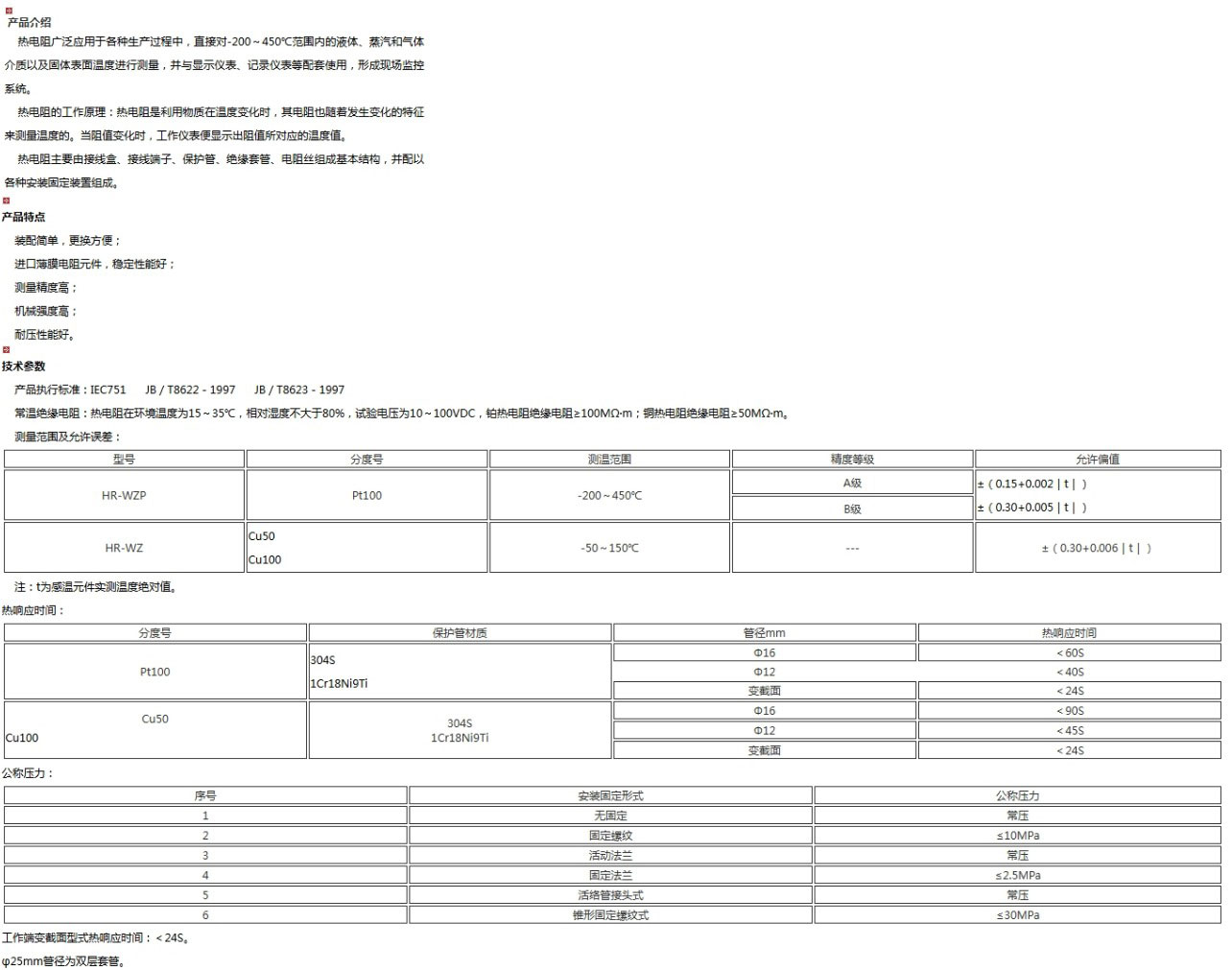 熱電阻(thermal resistor)是中低溫區(qū)最常用的一種溫度檢測器。熱電阻測溫是基于金屬導(dǎo)體的電阻值隨溫度的增加而增加這一特性來進(jìn)行溫度測量的。它的主要特點(diǎn)是測量精度高,性能穩(wěn)定。其中鉑熱電阻的測量精確度是最高的,它不僅廣泛應(yīng)用于工業(yè)測溫,而且被制成標(biāo)準(zhǔn)的基準(zhǔn)儀。